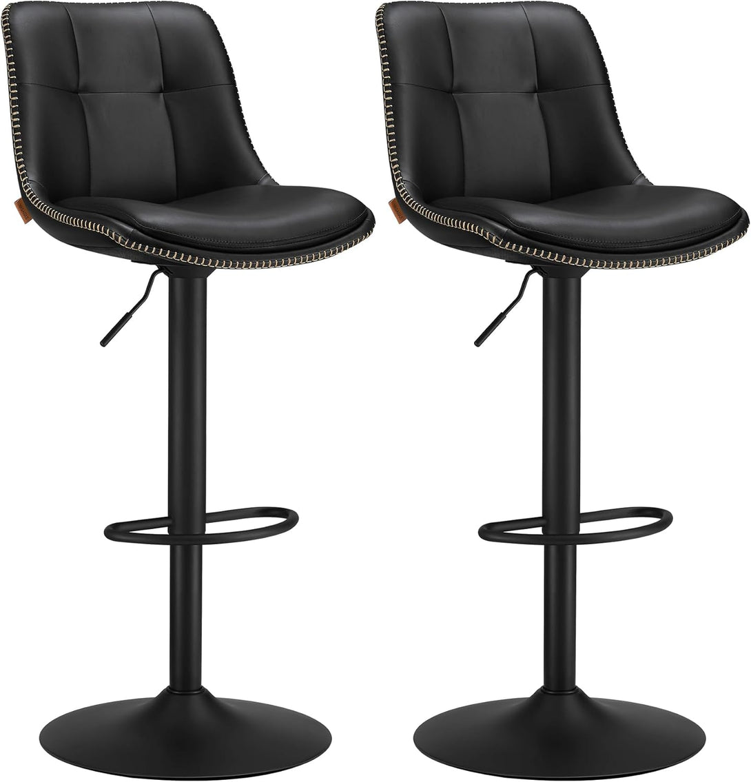 Set de 2 scaune înalte pentru bar, reglabilă pe înălțime, rotativă, scaune de bucătărie cu tapițerie din PU matlasată, cu spătar și suport pentru picioare, pentru dining sau blat de bucătărie, oțel, negru